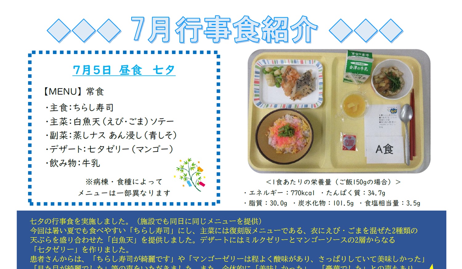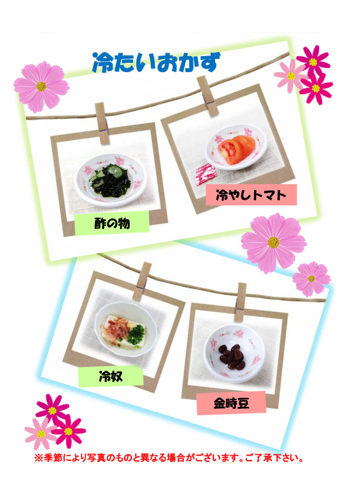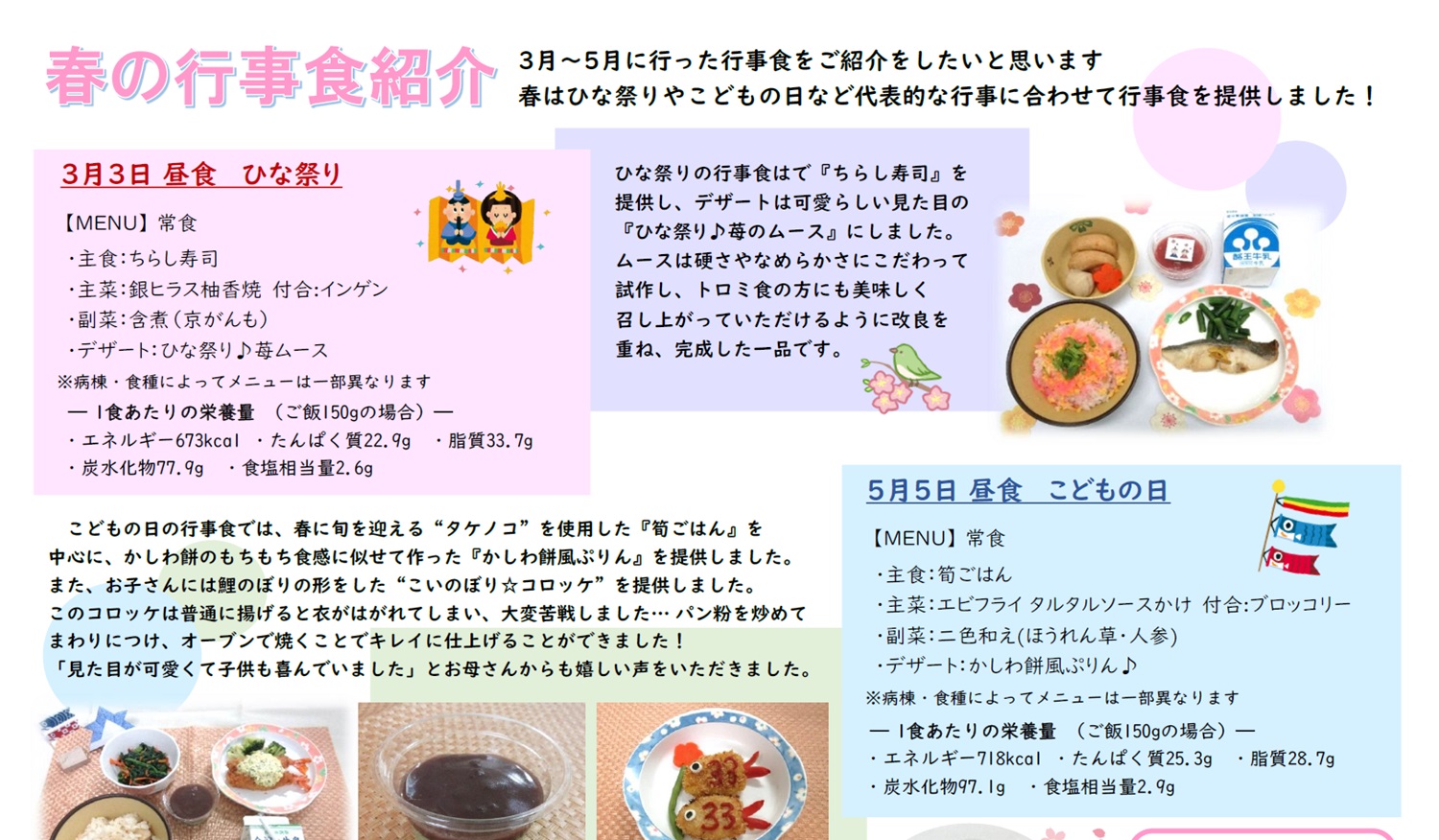 献立は季節の食材を取り入れ、行事食の実施など、患者さんに少しでも楽しんで頂けるような献立作成を心がけております。