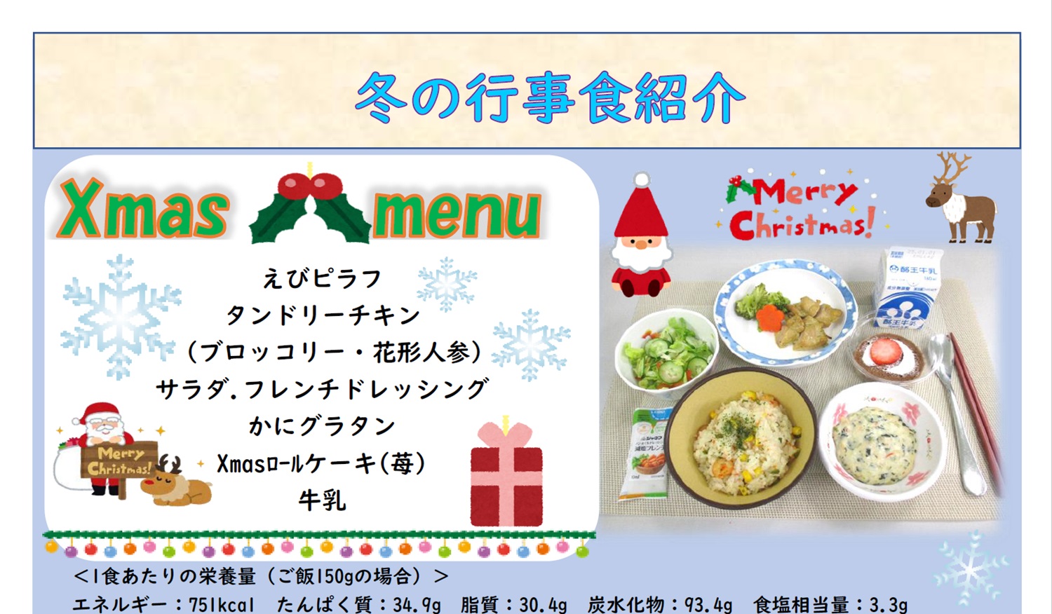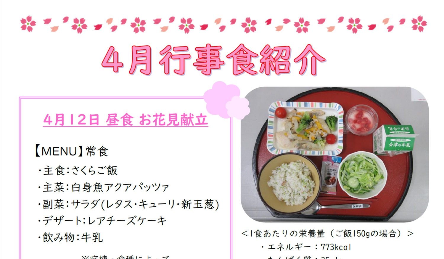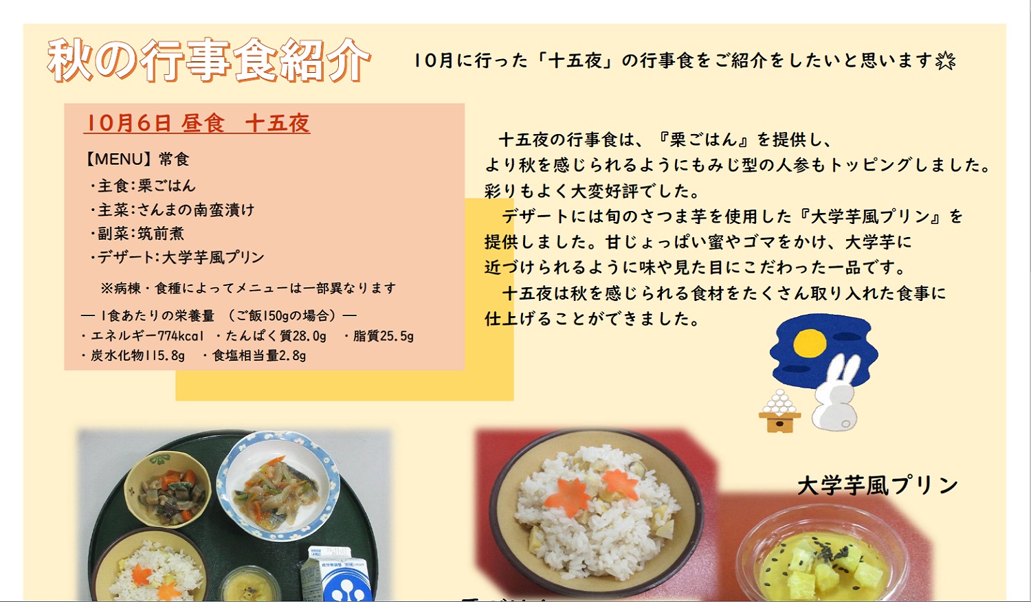 献立は季節の食材を取り入れ、行事食の実施など、患者さんに少しでも楽しんで頂けるような献立作成を心がけております。