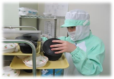 患者さんのもとに温かいものは温かく、冷たいものは冷たく安心して食べられるお食事が届けられるよう心がけ、日々業務に取り組んでおります。