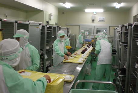 料理の盛付け、トレイメイク業務を行っています。
