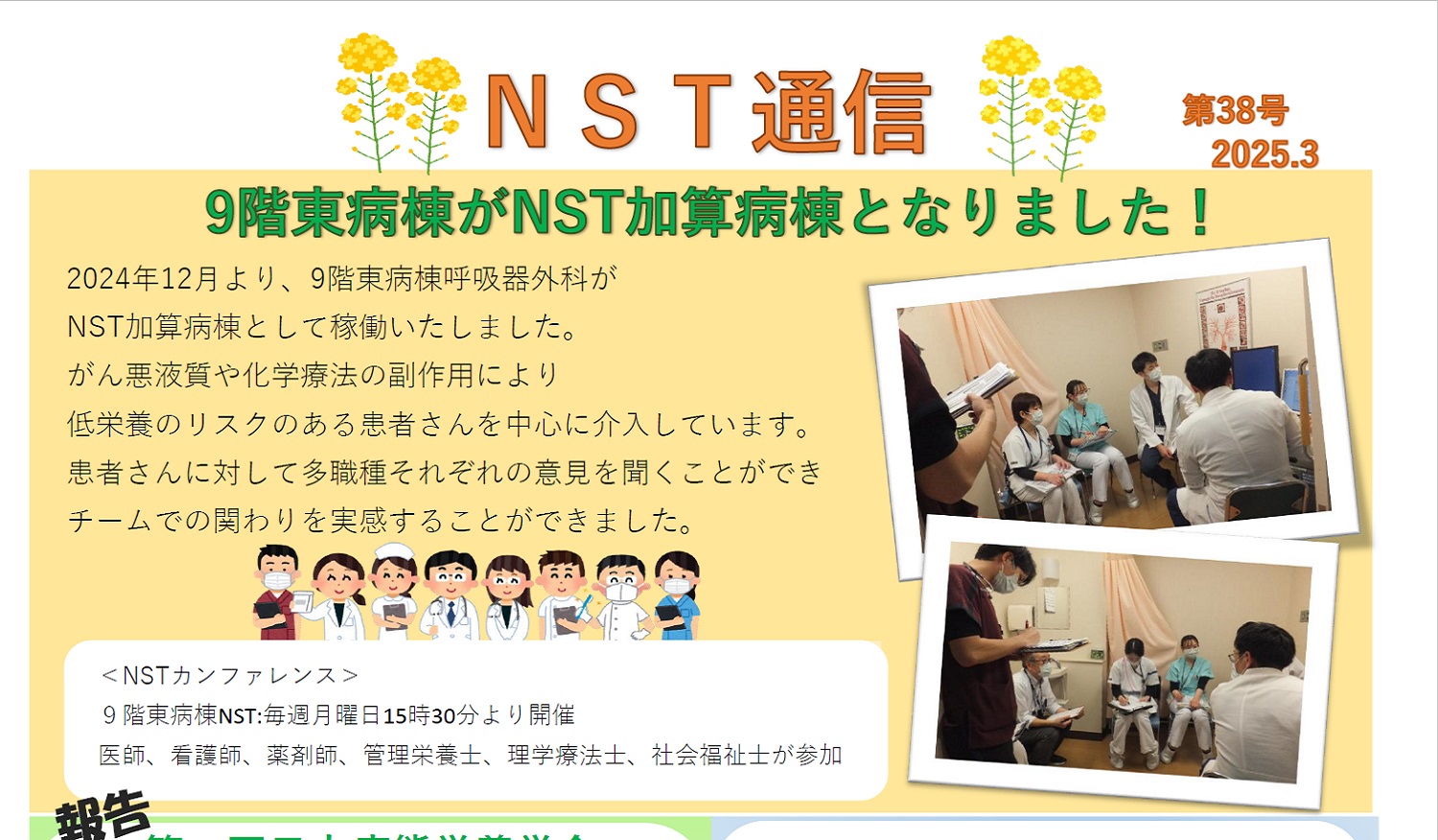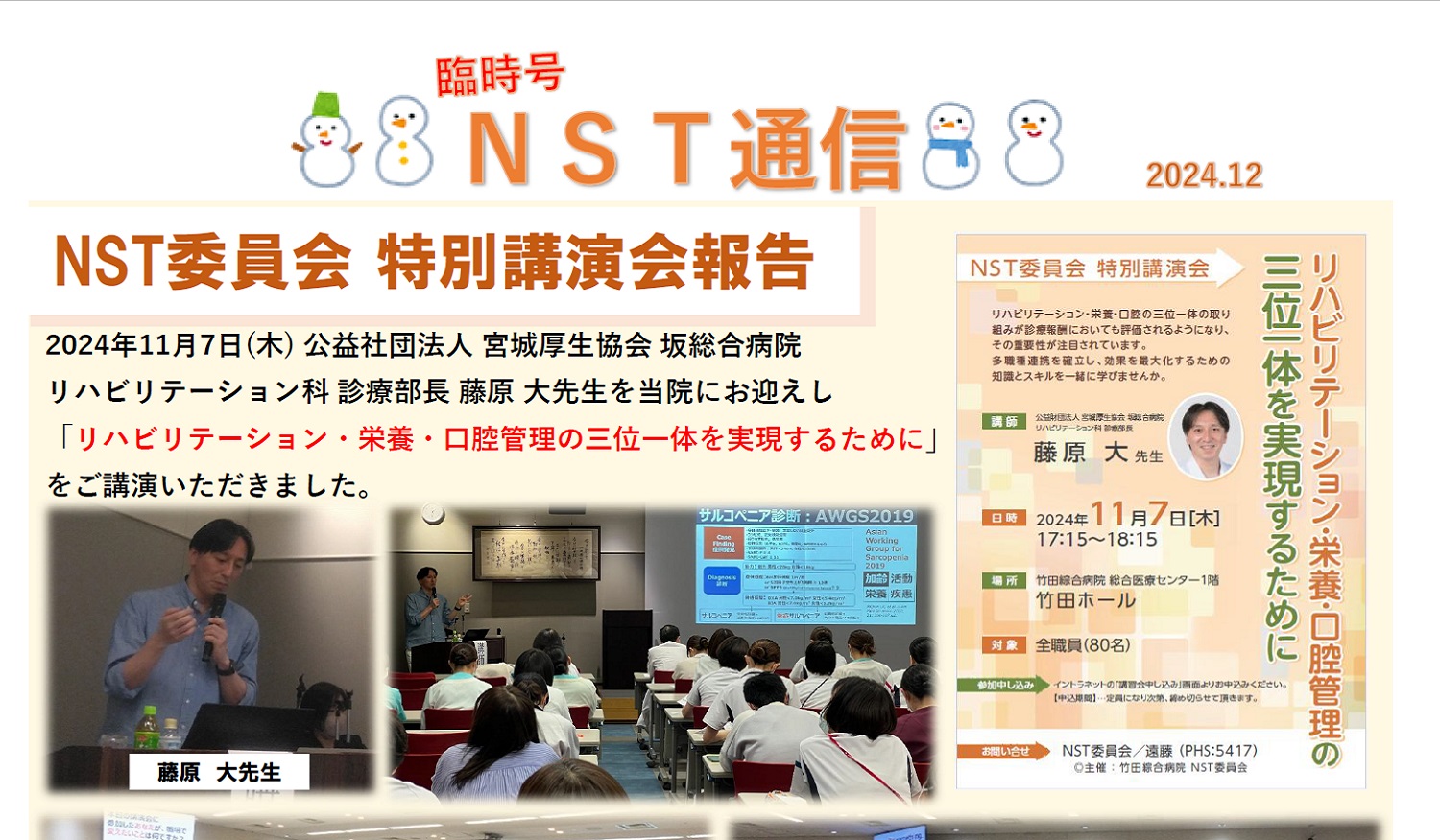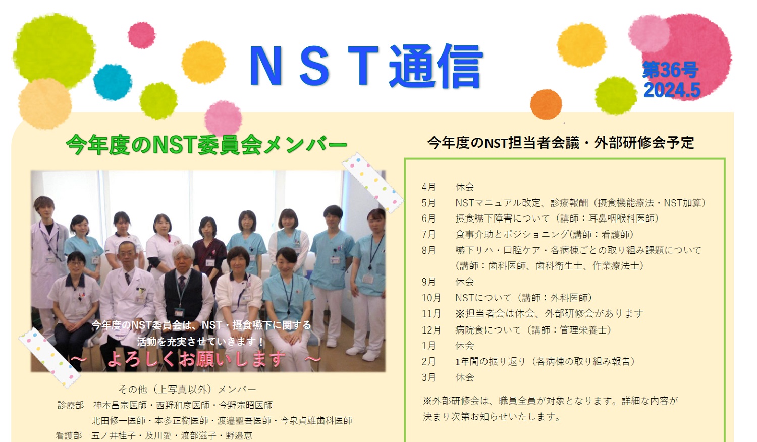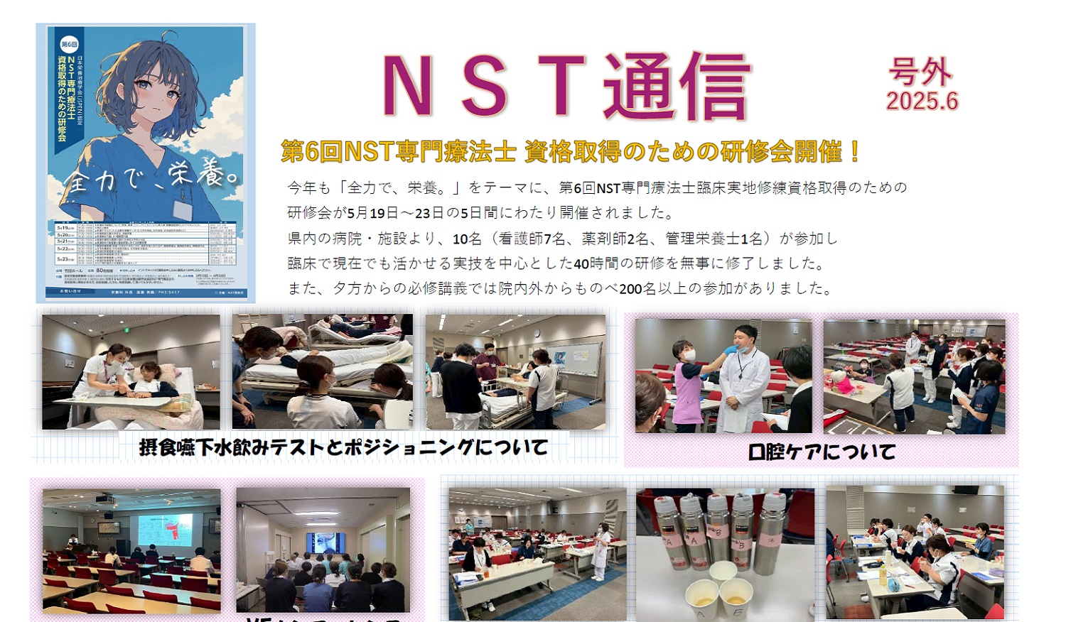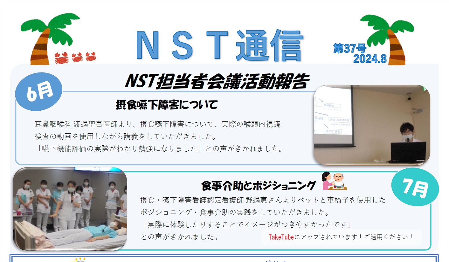 NSTマニュアルの作成、勉強会や講演会の開催、病棟ラウンドの実施など行っております。詳細は下記のNST通信をご覧下さい。