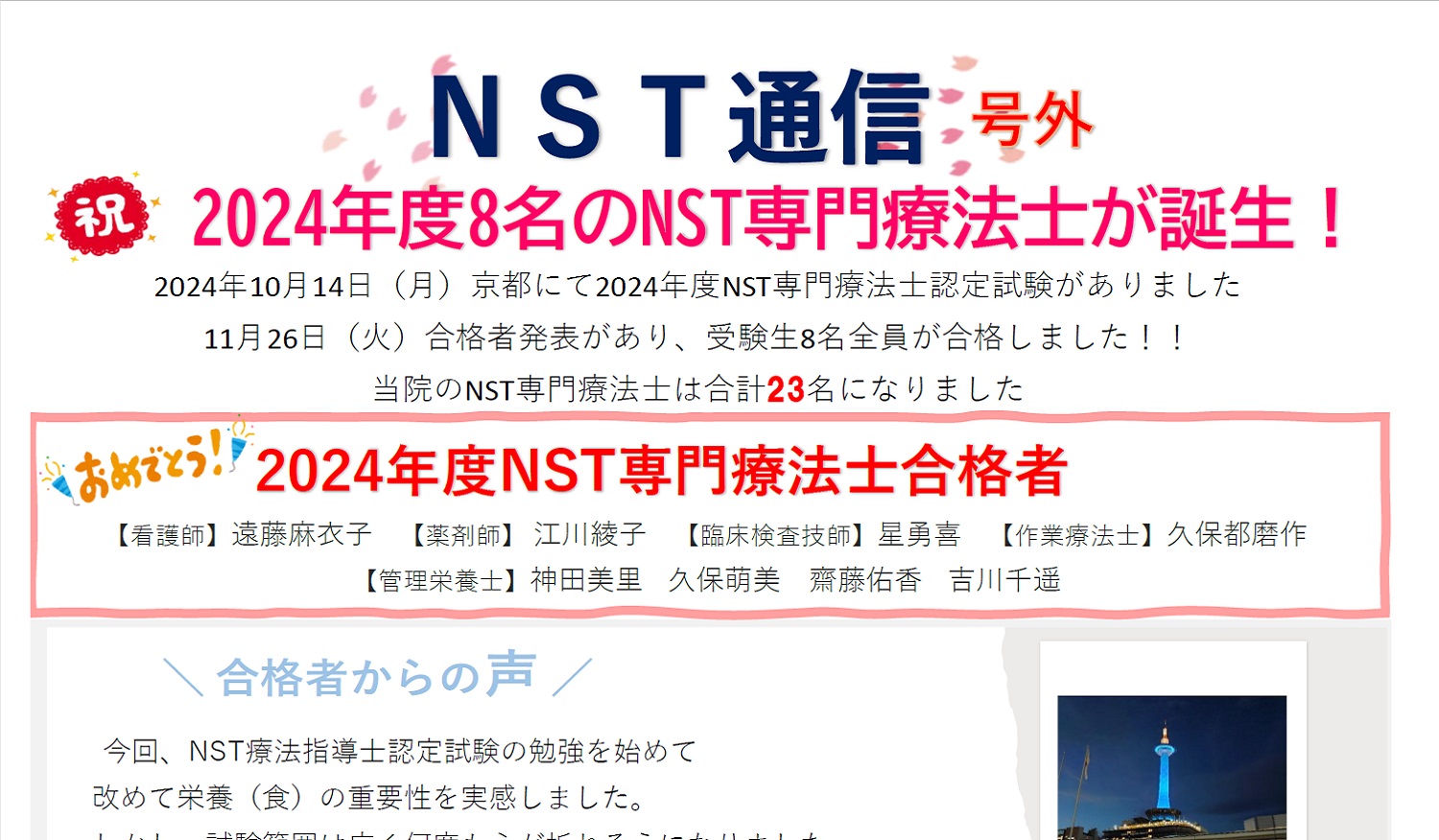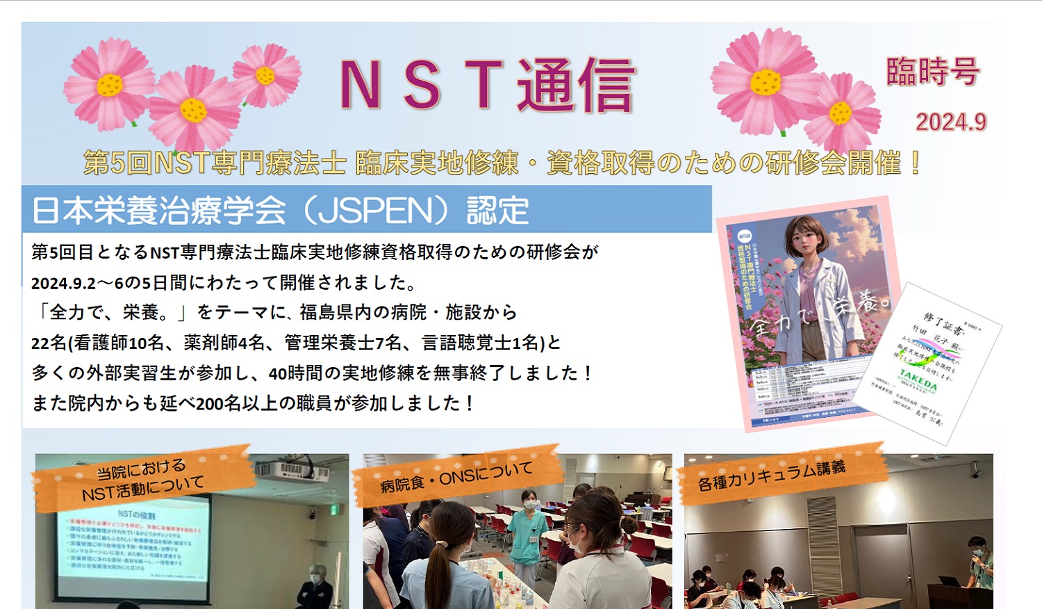 当院では平成21年3月に日本静脈経腸栄養学会の「NST稼動施設」の認定をされています。